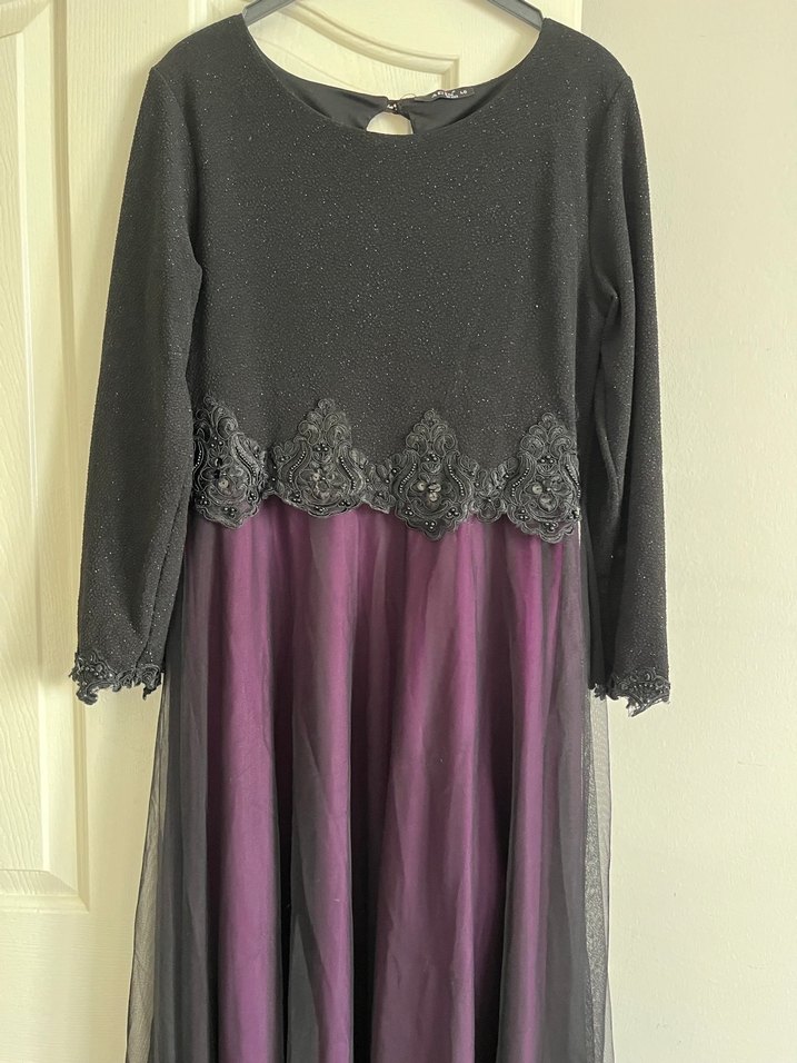 SON FİYATTTUzun kollu, siyah dantel detaylı üst ve mor drapeli etekli, bol kesim gotik elbise. Romantik akşamlar için ideal. 1 kez giyildi