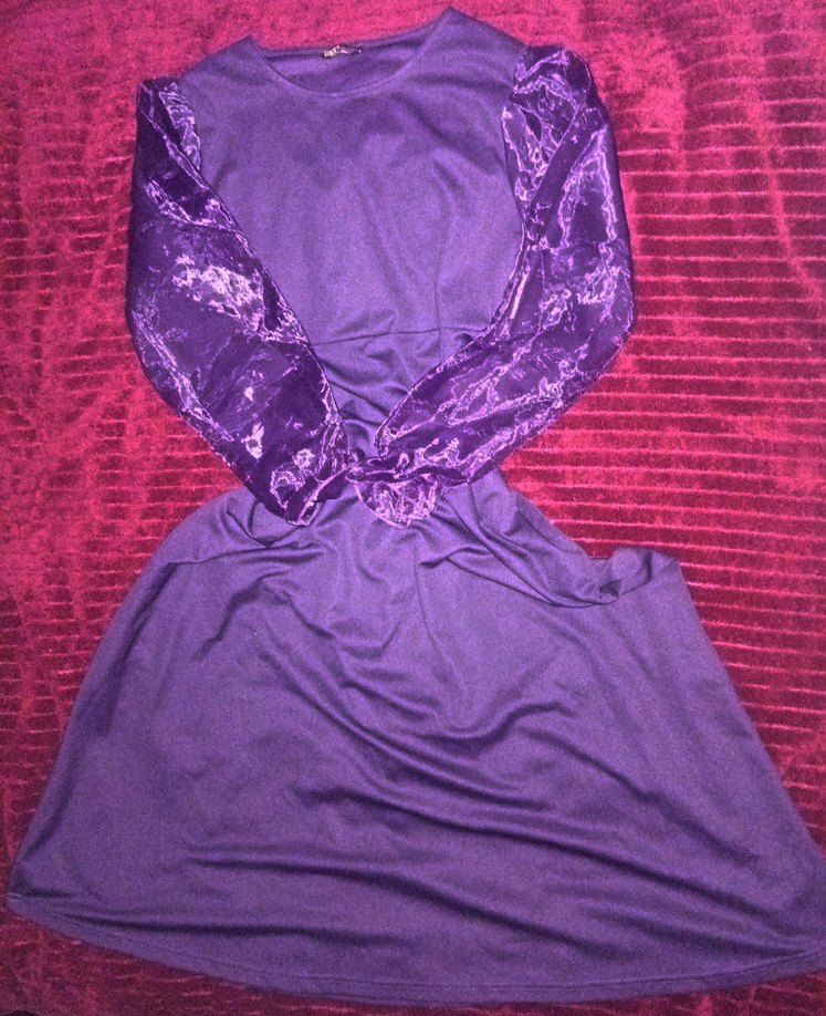 Bu mor, uzun ve vücuda oturan abiye elbise, drapeli tasarımı, uzun ve hafif transparan kolları ile gotik stile uygun, parti için ideal bir seçenektir.