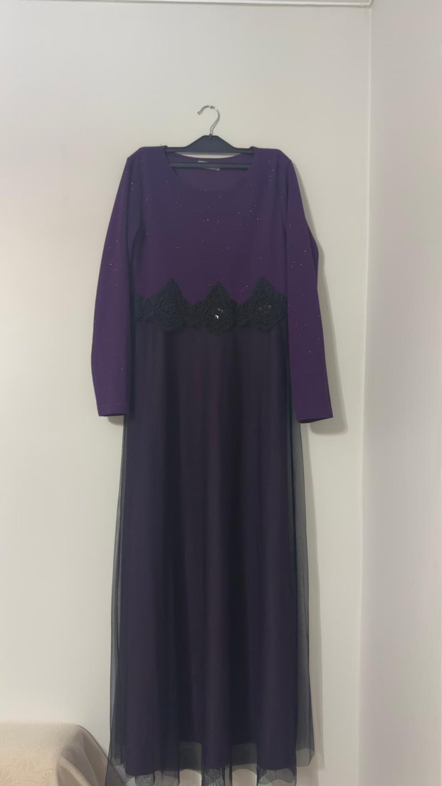 Uzun kollu, bol kesim mor kadın elbisesi, tek renk ve tekne yaka detaylıdır. Belinde siyah dantel süslemeli, yumuşak sentetik kumaştan yapılmıştır, düğün için uygundur.