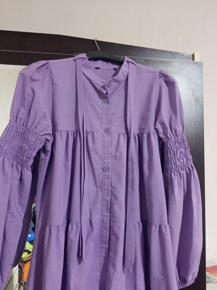 Mor renkte, uzun kollu ve fırfır detaylı bol kesim hamile bluzu. Keten kumaştan, yüksek yakalı ve düğmeli, rahat sokak stili için uygun.