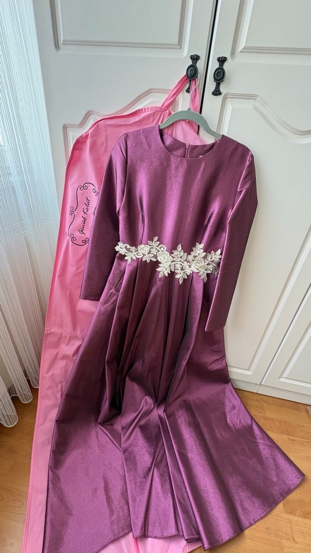 Uzun kollu, işlemeli bel detayı olan mor abiye elbise, vücuda oturan kesim ve modern klasik tarzda. Ürün tek seferlik kullanıldı resimlerde görüldüğü gibi çok temiz kullanıldı elbise üzerine kullandığım şalı da satışa koydum ilgilenmek isteyenler için Gönül kolat bedene göre özel tasarım bir elbisedir