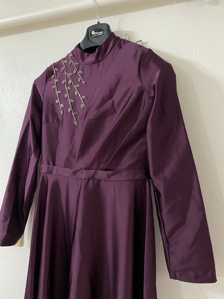 Bu uzun mor abiye elbise, yüksek yakalı ve uzun kolludur. Omuzda zarif işlemeler bulunur. Dökümlü ve parlak dokusu ile düğünler için uygundur.