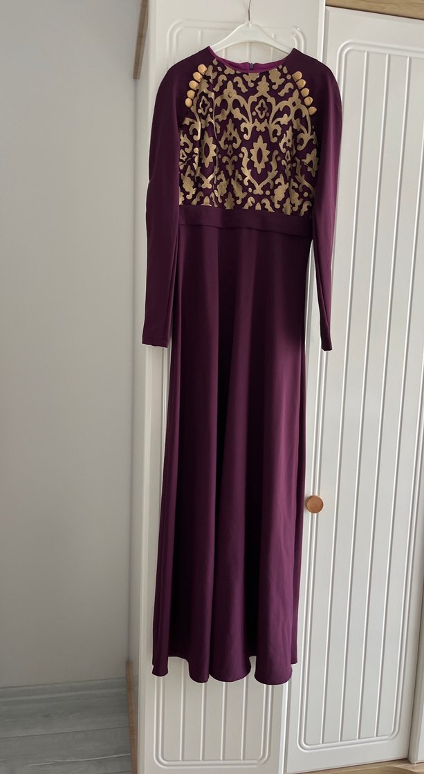 Uzun Kollu Mor İşlemeli Abiye Elbise