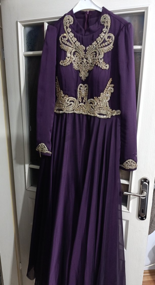 Uzun kollu ve yüksek yakalı mor abiye elbise, işlemeli detayları ve drapeli yapısıyla klasik ve şık bir görünüm sunar. ✨