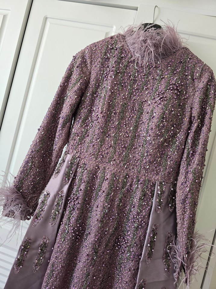 Uzun kollu, yüksek yakalı mor abiye elbise, işlemeli ve tüy detaylı, şık ve gösterişli tasarım. sadece 1kere giyildi