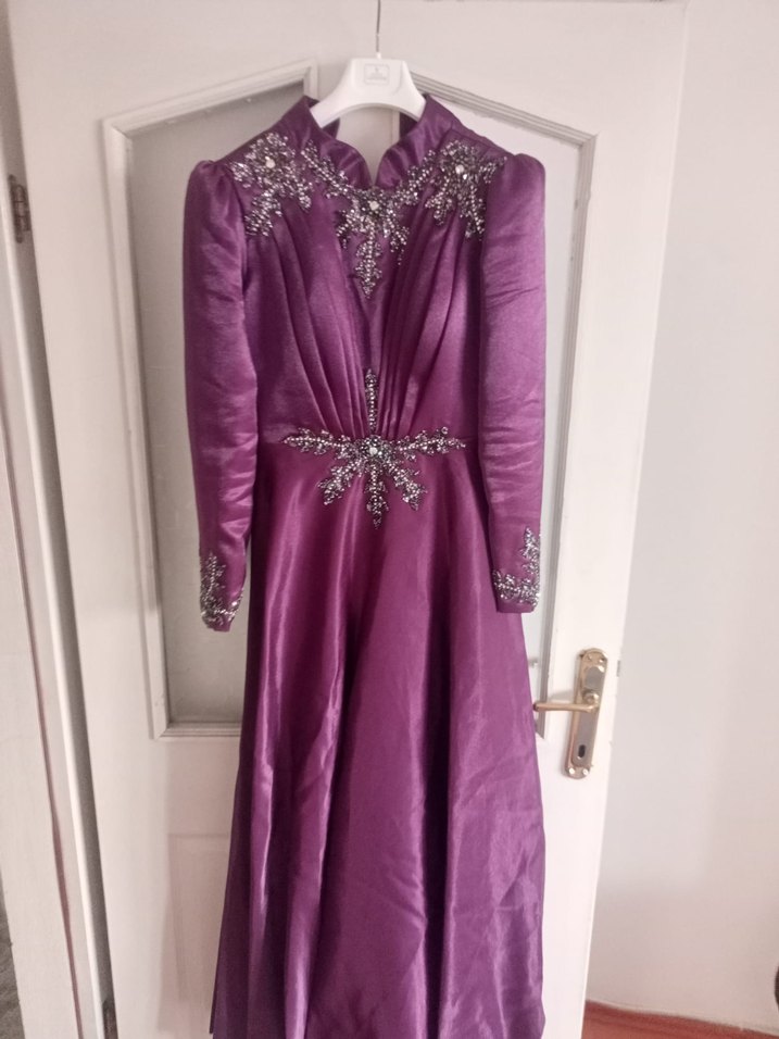 Uzun Kollu Mor İşlemeli Abiye Elbise