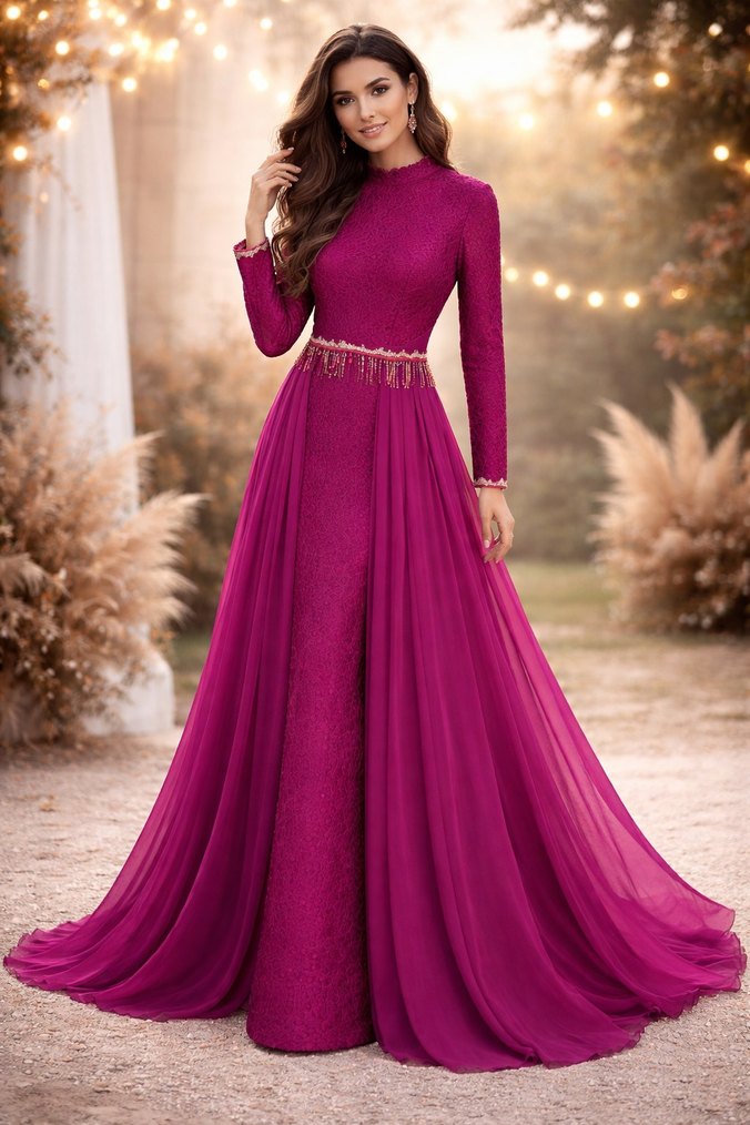 Uzun Kollu Mor İşlemeli Abiye Elbise