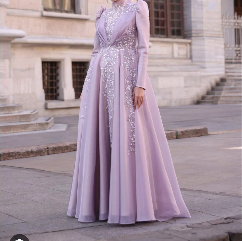 Uzun, pastel mor renkli bu abiye elbise, drapeli tasarımı ve işlemeli detaylarıyla dikkat çeker. Uzun kollu ve kesimli yakalı, modern klasik kesime sahiptir. 2 defa giyildi görselde ki gibi kuru temizleme gerektiriyor ön büzgüleri açtıra bilme şansınız var silikon yapılmalıdır ben severek giydim alıcıya hayırlı olsun 170 boyunda 74 kilo ile giydim gayet iyi oldu