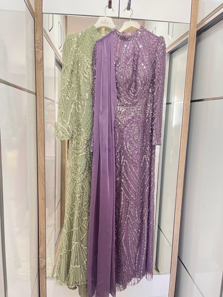 Uzun Kollu Mor İşlemeli Abiye Elbise nişanlık 38 beden