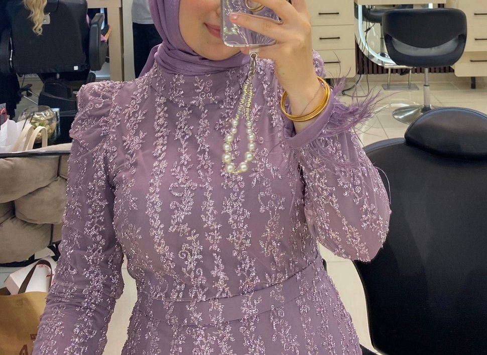 Uzun Kollu Mor İşlemeli Abiye tesettür Elbise