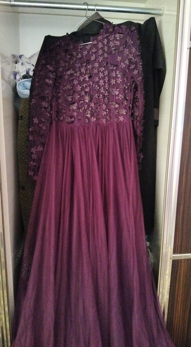 Uzun Kollu Mor İşlemeli Kadın Abiye