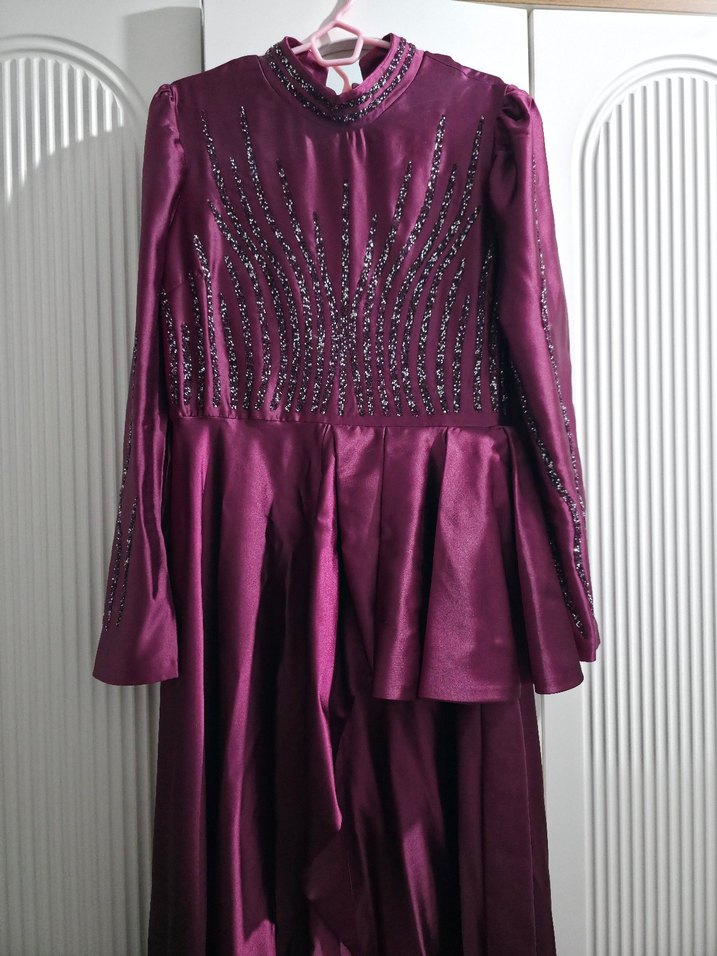 Uzun kollu, mor işlemeli, yüksek yakalı ve vücuda oturan bu abiye elbise düğünler için uygundur. 1 kez giyildi. Yeni gibidir.✨