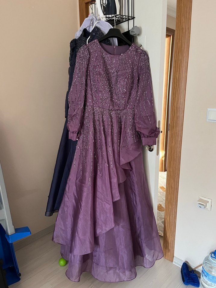 Uzun Kollu Mor İşlemeli Kadın Abiye Elbise