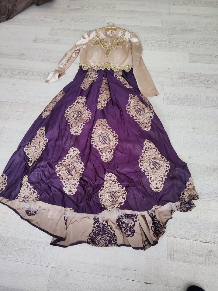 Uzun kollu, hakim yakalı ve bol kesim kadın elbisesi. Mor renginde, işlemeli ve drapeli detaylarla süslenmiştir. Düğün ve özel günler için uygundur.