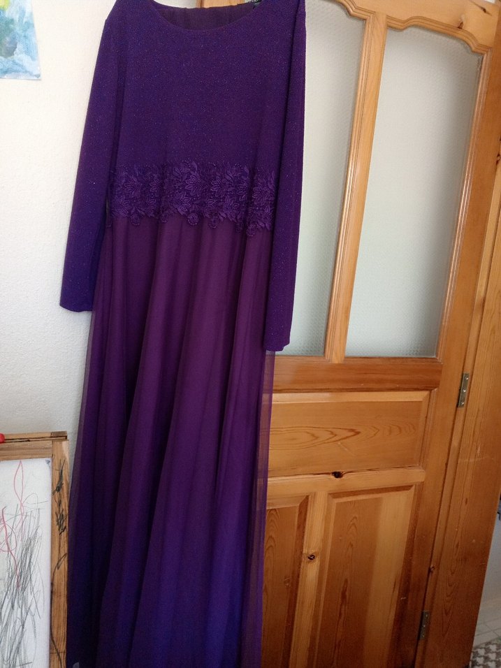Uzun kollu, bol kesim mor abiye elbise. Drapeli, yuvarlak yaka ve sade dokusuyla düğünlere uygun.