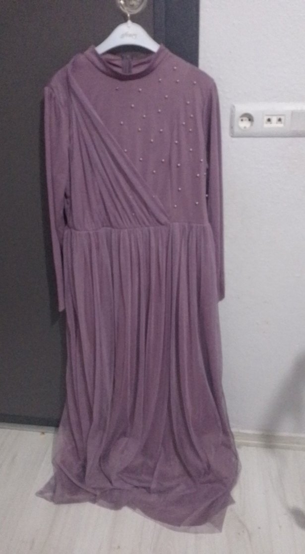 Uzun kollu, yüksek yakalı ve drapeli mor abiye elbise. Bol kesim ve klasik şıklık sunar, düğünler için uygundur. Desensiz ve zarif süslemelidir.