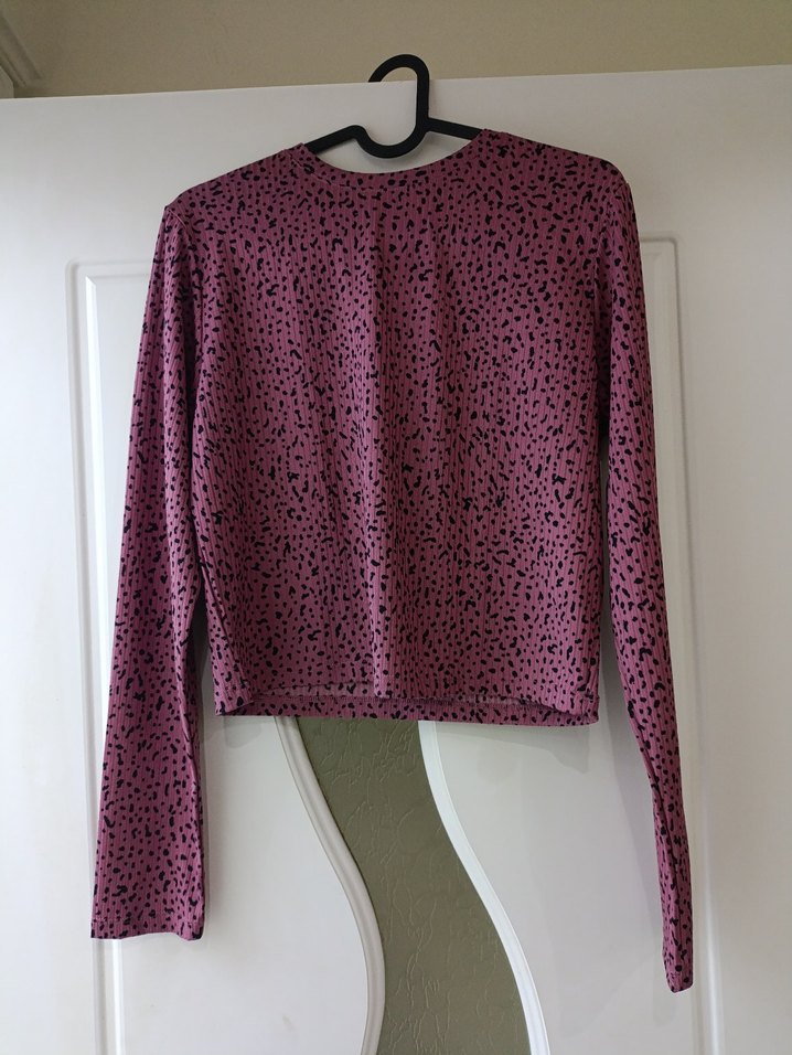 uzun kollu, yuvarlak yakalı, sentetik kumaştan mor baskılı kadın bluz. Normal midi boyda, rahat kesim, günlük sokak stiline uygun.