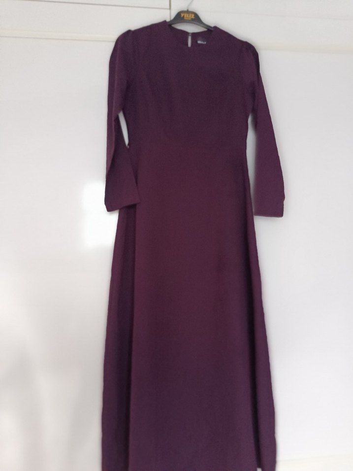 Uzun kollu, mor drapeli kadın elbisesi. Satenimsi kumaştan, modern klasik tarzda, sade ve mütevazı duruşa sahip, günlük kullanım için uygun.