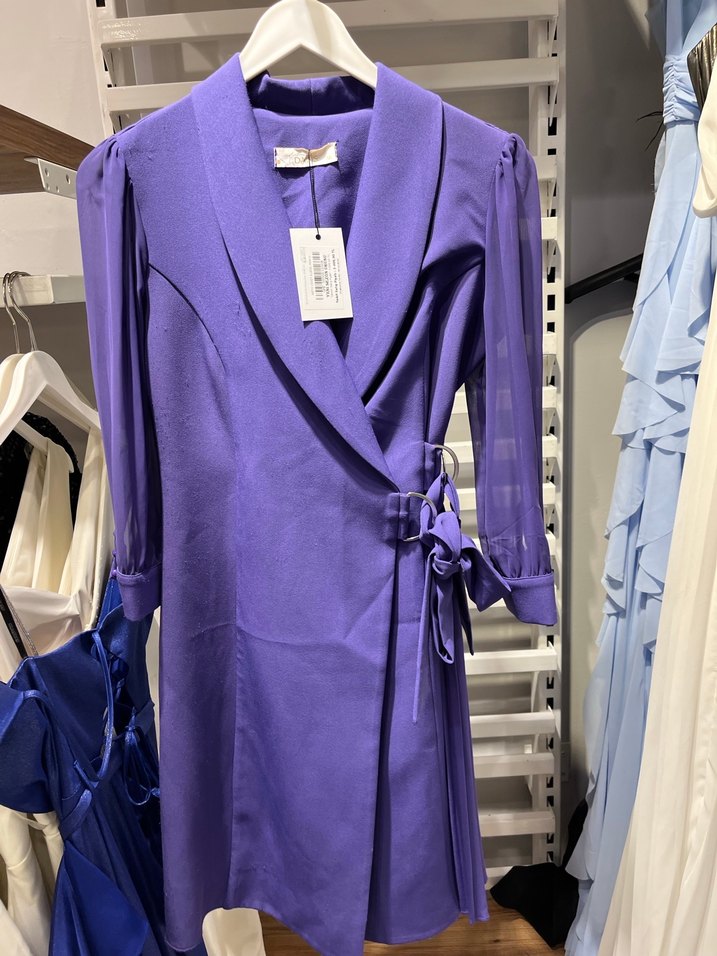 Bu koyu mor, uzun kollu kadın elbise, düzenli kesime ve baskılı desene sahiptir. Paris sokak modasını yansıtır ve yan bağlamalı sarma detayına sahiptir. 36/38 bedenler mevcuttur