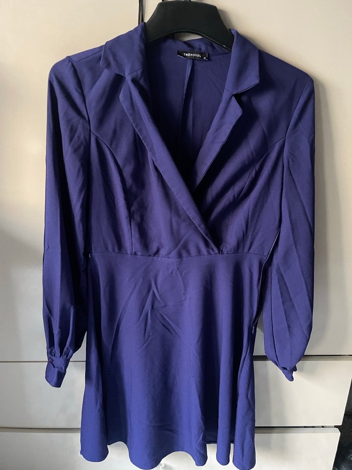 Uzun kollu, mor renkli, vücuda oturan midi elbise. Düz ve koyu renkte, iş ve sokak stiline uygun.