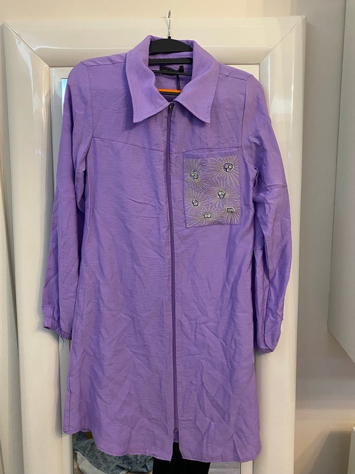 Uzun Kollu Mor Kadın Keten Ceket
