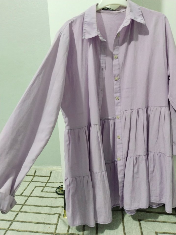 Düğmeli, yakalı, uzun kollu, bol kesim ve uzun boylu mor keten gömlek, bohem tarzda günlük kullanıma uygun.