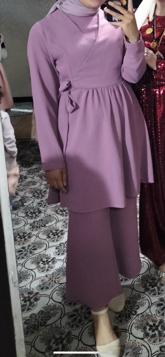 Kadın takımı, uzun boy, drapeli ve normal kesimdir. Çentikli yaka ve uzun kollu, koyu mor sentetik kumaştan, ofis için uygundur.