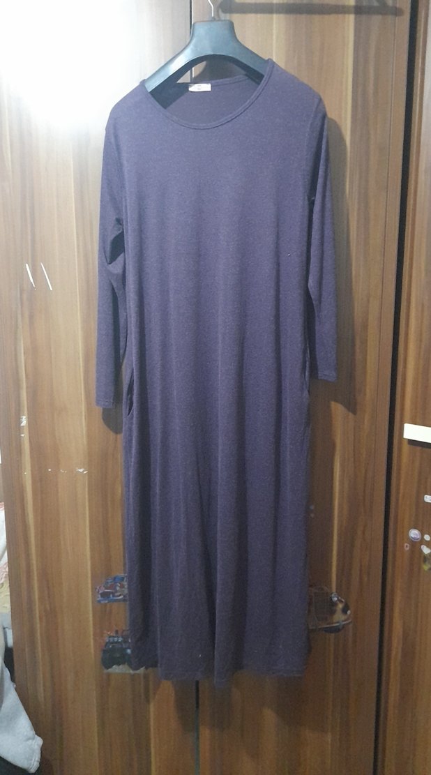 Kadınlar için uzun, triko kumaştan yapılmış, yuvarlak yakalı ve uzun kollu elbise. kırçıllı-mor tonlarında, desen içermeyen, bol kesim, yandan cepli ve sade tasarıma sahiptir.