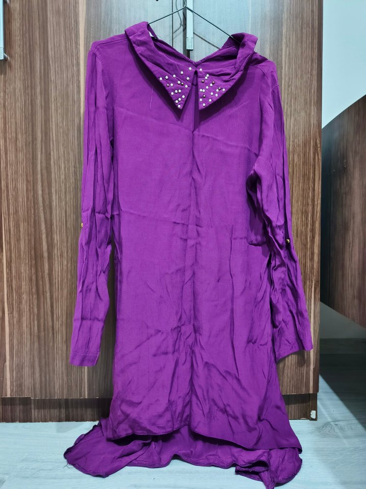 Mor renkte, yakası taşlı uzun kollu, dökümlü ve bol kesimli, ipeksi dokulu kadın tunik. Hesabımdan diğer ürünlere bakabilirsiniz.