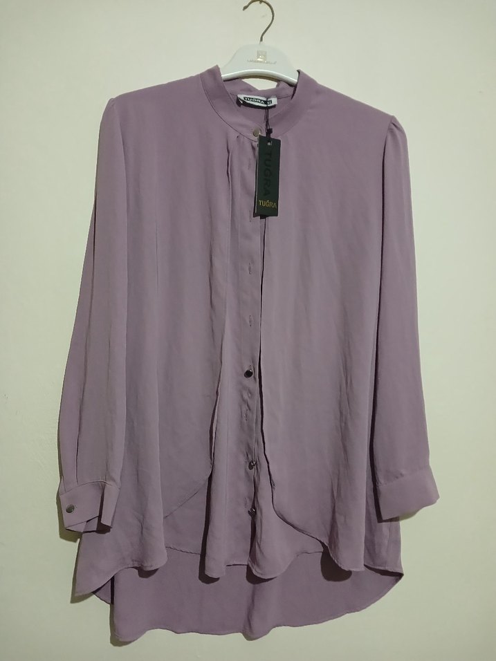Yüksek yakalı, düğmeli manşetli uzun kollu mor kadın tunik. Bol kesim ve uzun boy, yumuşak ve ipeksi kumaştan yapılmıştır. Desensiz, günlük rahat kullanıma uygundur.