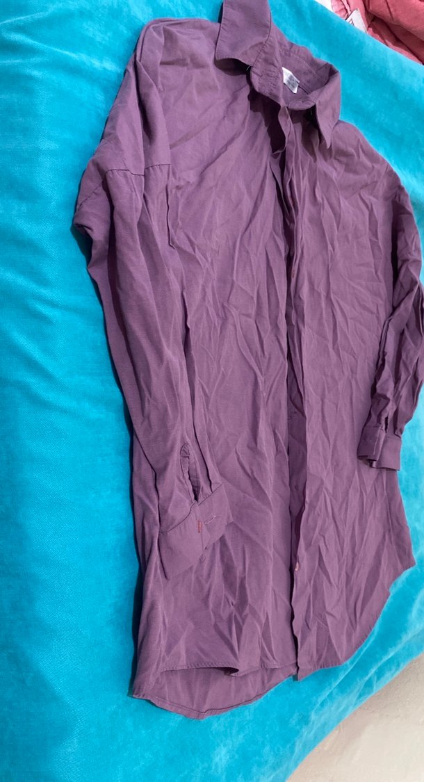 Uzun kollu, keten kumaştan mor salaş gömlek, drapeli ve kesik yakalı. Minimalist sokak stili için uzun ve rahat kesim.