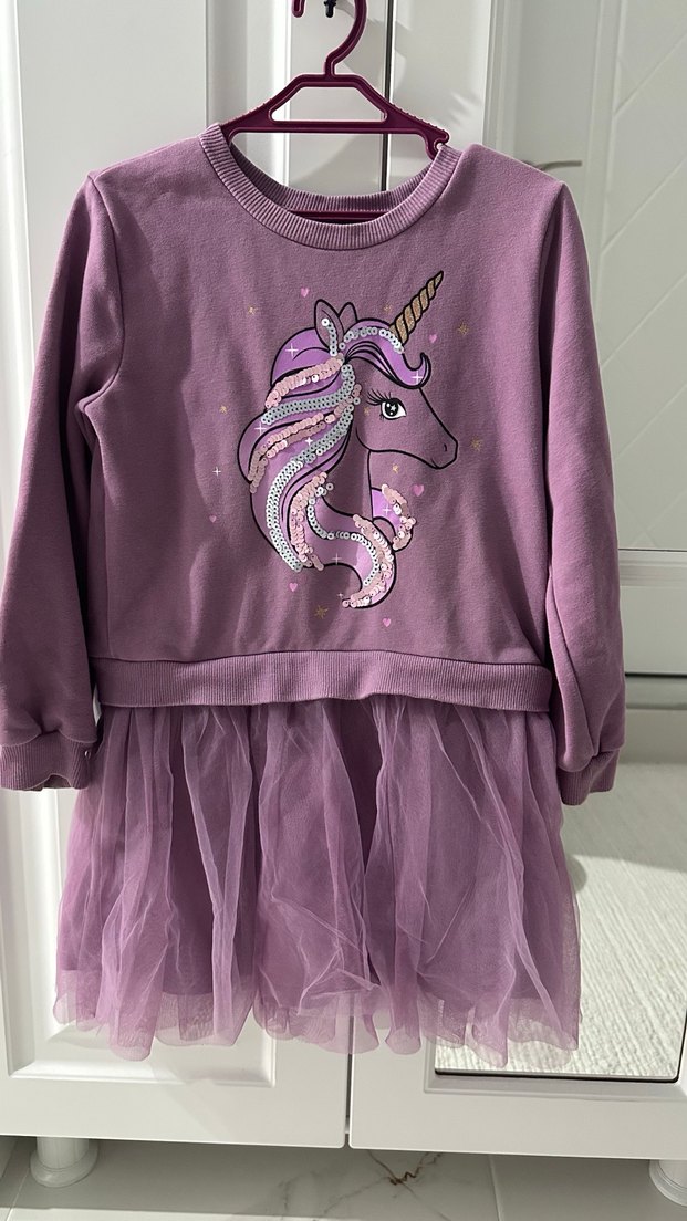 Pastel mor renkli, uzun kollu, yuvarlak yakalı ve bol kesimli kız çocuk elbisesi. Nakışlı unicorn detayı ve fırfırlı tül etek tam beden temiz hiçbir sıkıntısı yoktur..