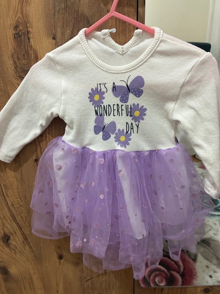 Pamuk kumaştan, uzun kollu, bisiklet yakalı, mor tonlarda, kelebek ve çiçek baskılı, fırfırlı etekli, vücuda oturan kız çocuk elbisesi. 2-5 ay arası uyumludur bir kere giyildi