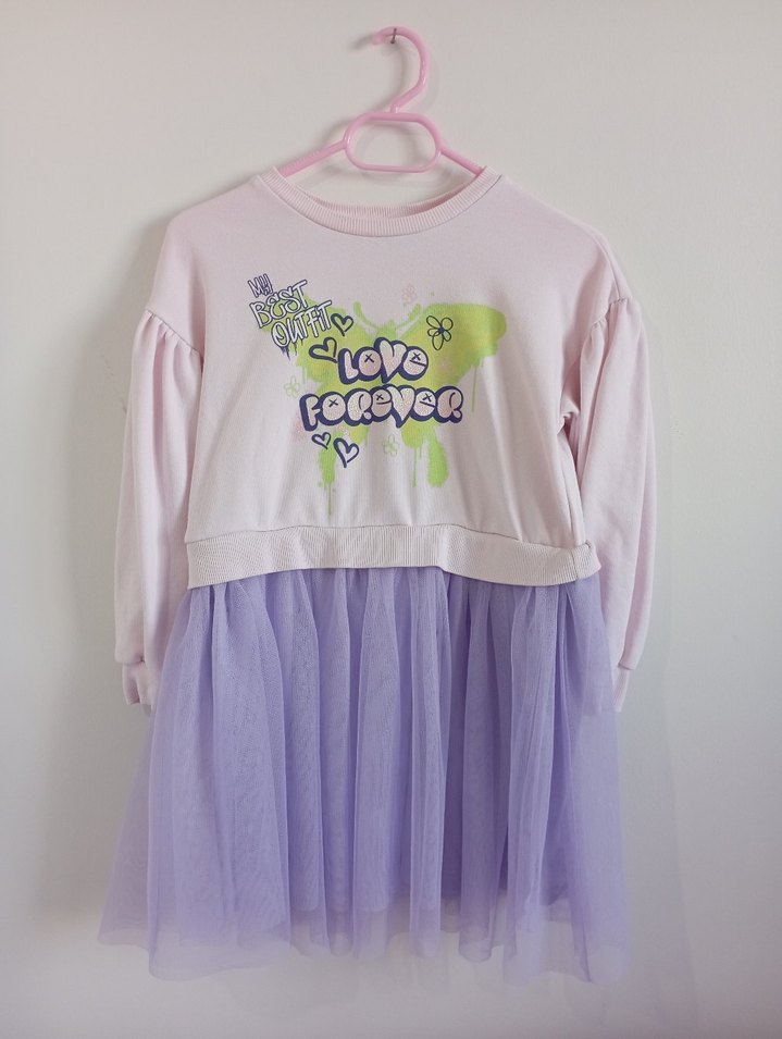 Uzun kollu, salaş kesim ve bisiklet yaka kız çocuk elbisesi. Pastel mor renk, batik desen ve fırfır detayları bulunur. Sentetik kumaştan, sokak stiline uygun.