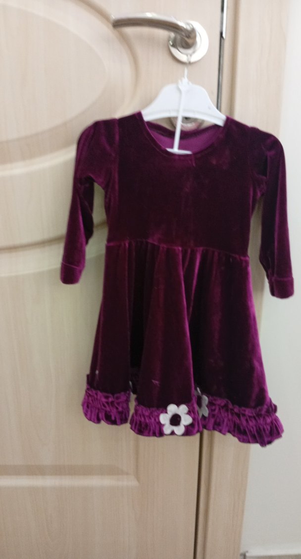 Mor uzun kollu kız çocuk elbisesi, bol kesim, fırfırlı ve etek kısmında renkli nakışlı çiçek detayları içerir. Yuvarlak yaka ve yumuşak, sıcak kumaştan yapılmıştır.