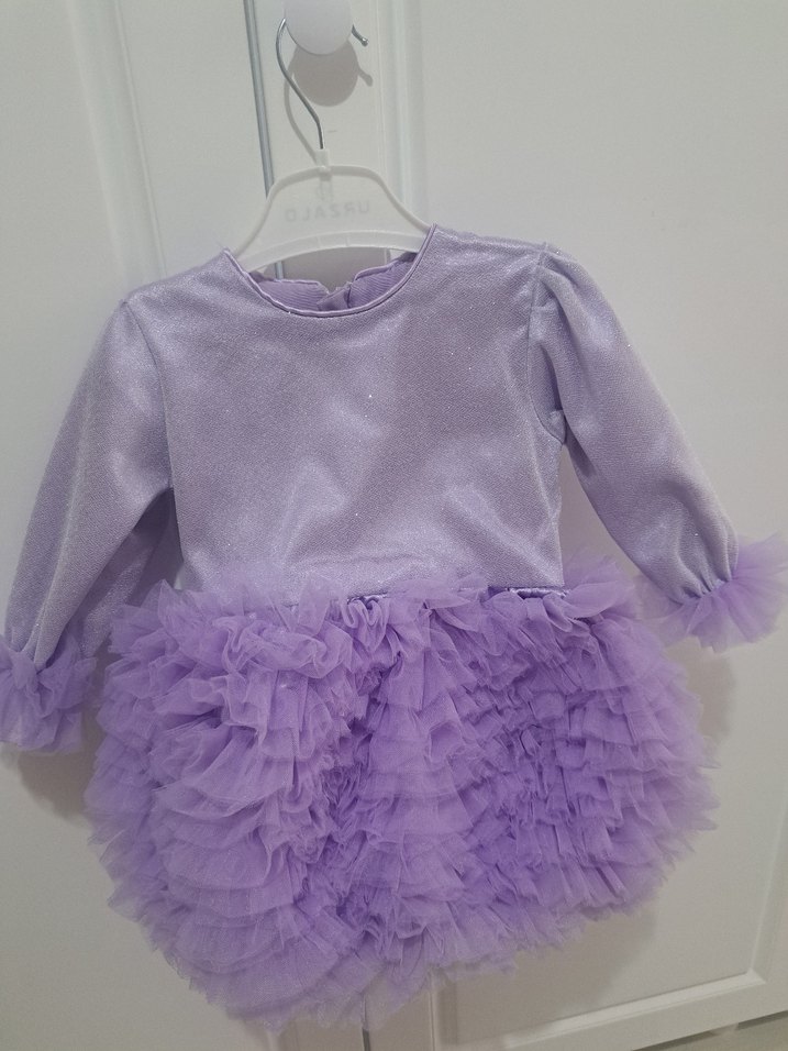 Mor renkli, uzun kollu, bisiklet yaka kız çocuk elbisesi. Fırfırlı detaylı