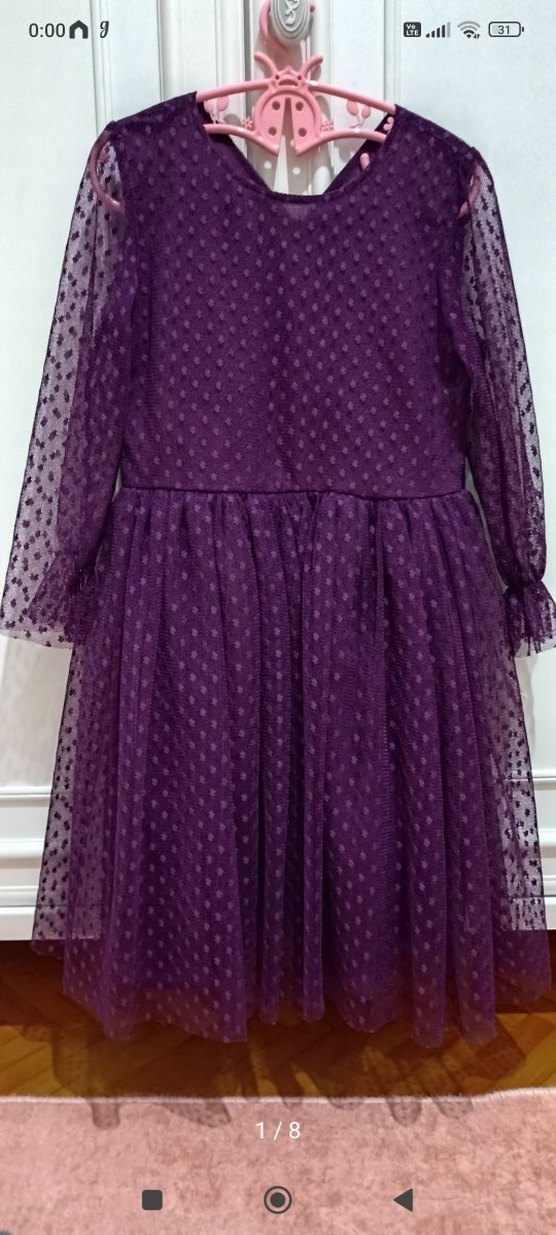 Koyu mor renkte, uzun kollu ve V yakalı kız elbisesi. Sentetik kumaş, fırfır detaylar ve bol kesimle gotik tarz sunar. afengim marka okul gösterisi için alınmıştı iki kere giyildi.