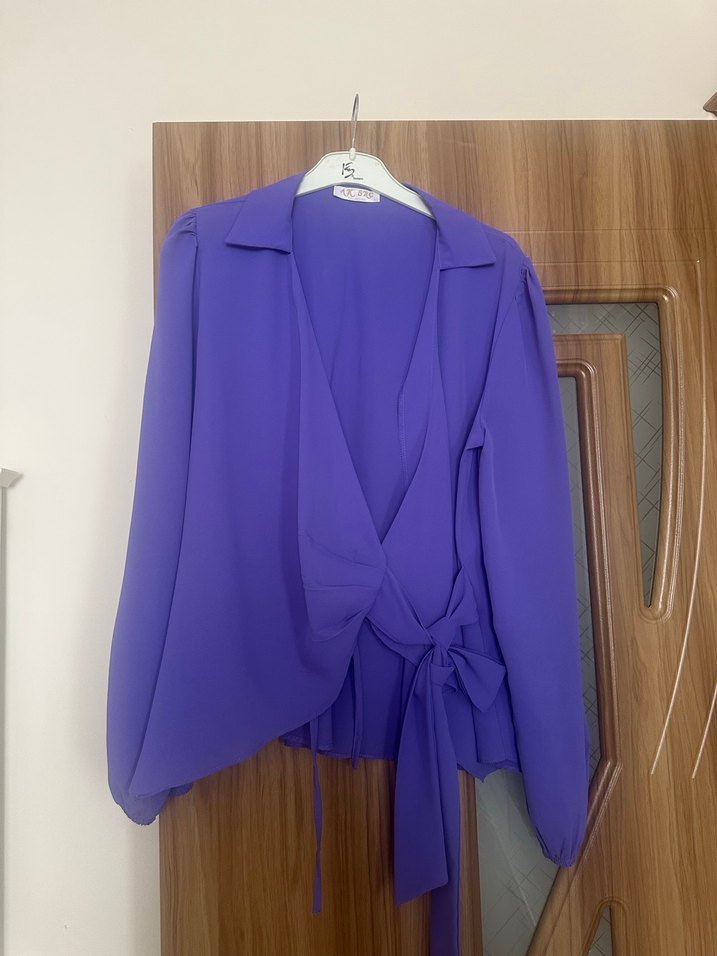 Uzun kollu, bol kesim ve drapeli tasarıma sahip kadın gömlek. İpeksi kumaştan, V yakalı ve pastel mor renkte, şık ve rahat bir ofis görünümü sunar.