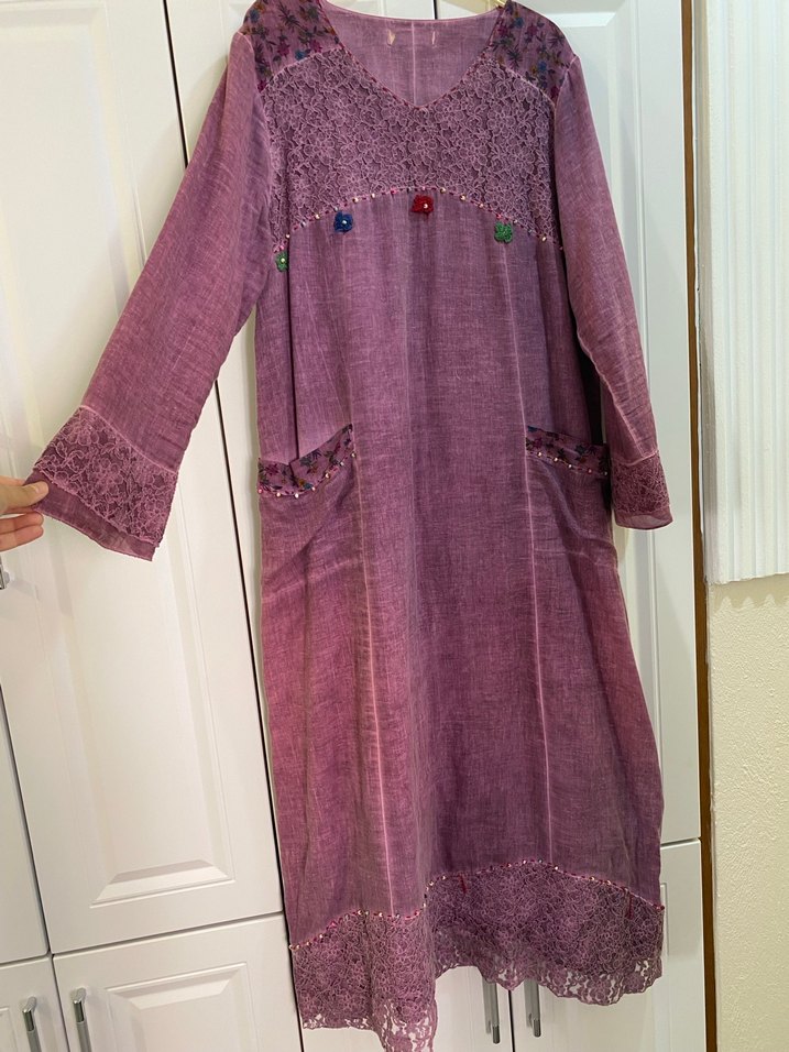 Mor renkli, uzun kollu, nakışlı bohem elbise. Düğmeli detaylar ve cepler bulunur. Salaş kesimiyle günlük kullanıma uygundur.