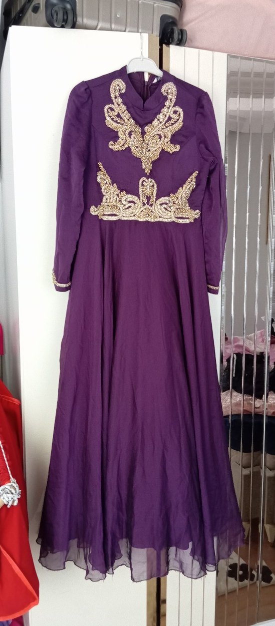 Uzun kollu, V yaka, bol kesim, mor renkte, parlak nakışlı ve drapeli kadın elbisesi. Klasik ve bohem tarzda, düğün için uygun. Boy 145 iki kol arası 45
