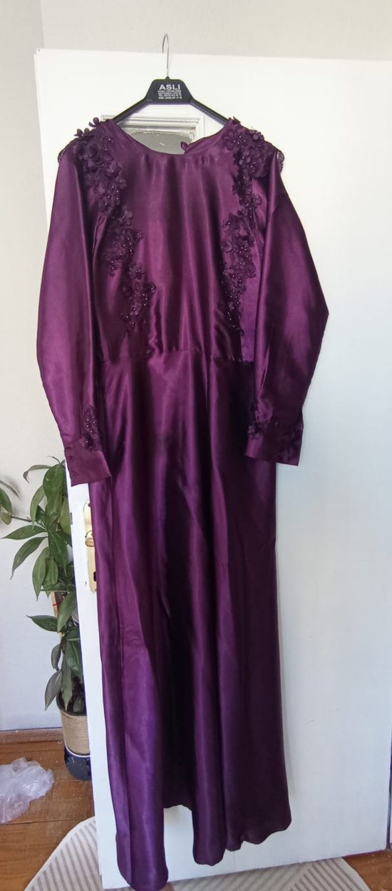 Bu uzun mor elbise, yüksek yakalı ve uzun kollu, nakış detaylarıyla süslenmiştir. Salaş kesim ve drapeli tarzda, vintage düğünler için uygun. özel dikim bir kez tek giyildi