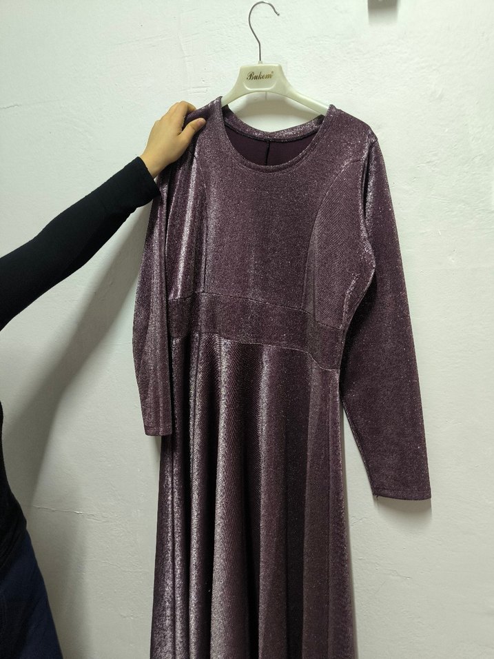 Uzun Kollu Mor Parlak abiye - Görsel 3