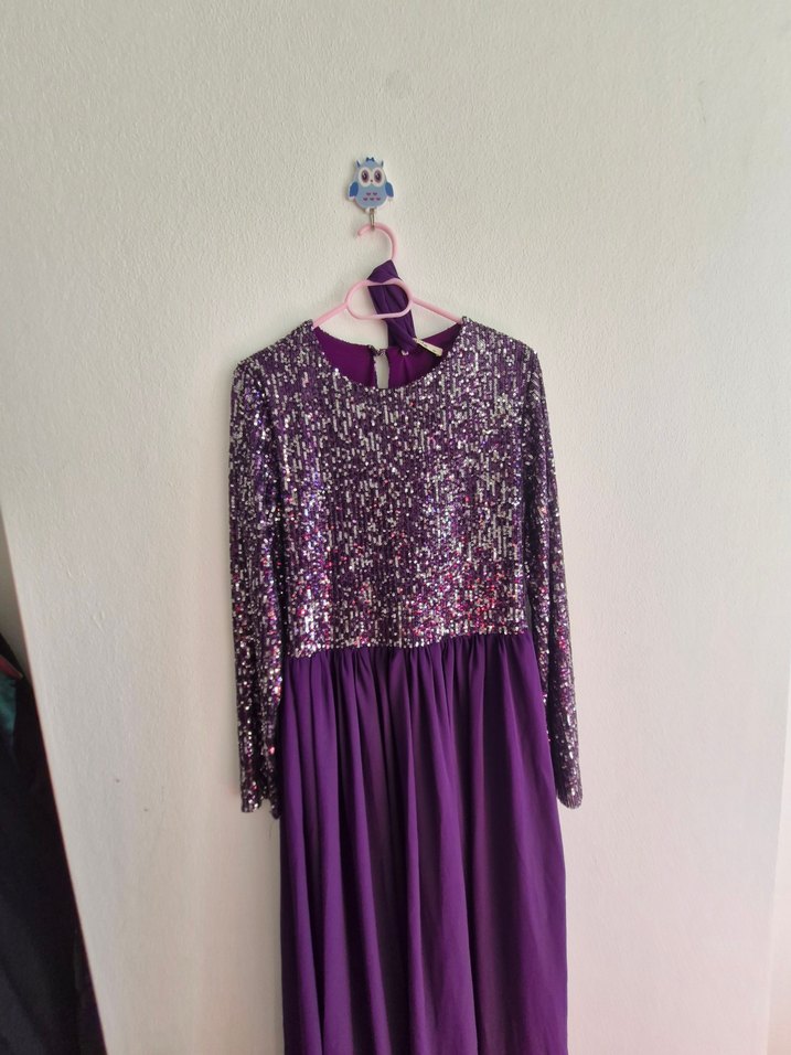 Uzun Kollu Mor Payetli Bohem Abiye Elbise