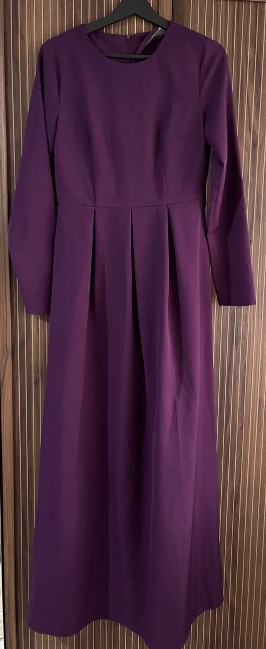 Uzun kollu, pilili ve notlu yaka detaylı mor elbise, yumuşak sentetik kumaştan, klasik ve minimalist tarzda, ofis kullanımı için uygundur.