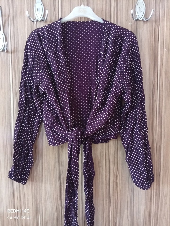 Uzun Kollu Mor Puantiyeli Bağlamalı Bluz
