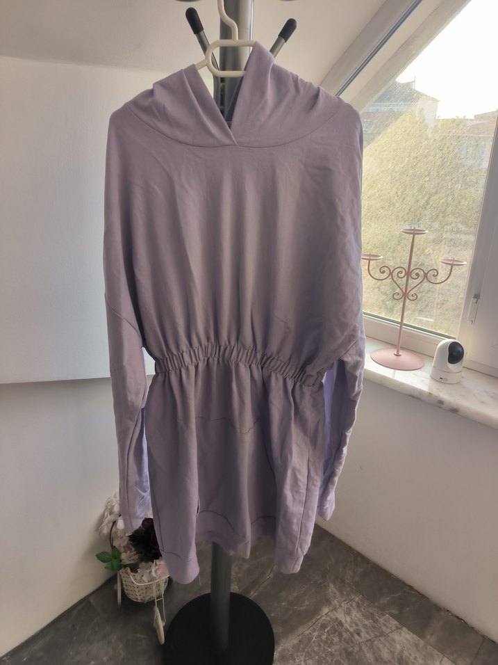 Mor renkte, uzun kollu ve yüksek yakalı salaş midi tunik, drapeli ve belden büzgülü tasarımıyla günlük sokak stiline uygundur. lekeler mevcutur önde ve arakada kumaşın durumu ancak çok iyi resimdeki gibi dir