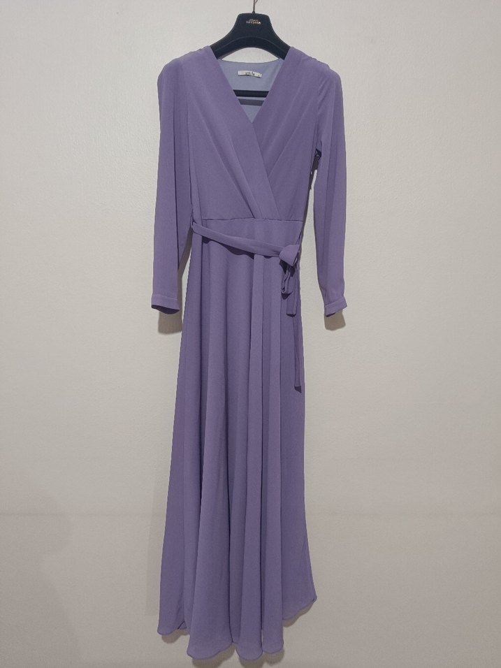 Uzun kollu, V yaka ve drapeli tasarıma sahip mor uzun elbise. Şalıyla beraber gönderilecektir. şifon uçuş uçuş tertemiz elbise 42 beden yazsa da 40 beden uyumludur.