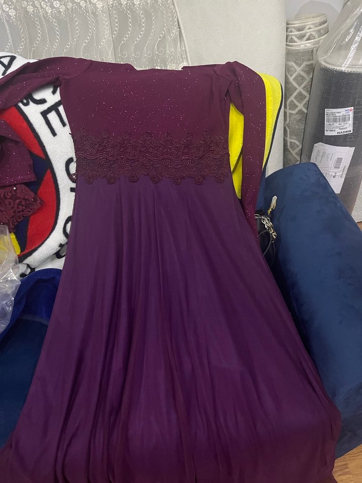 Uzun kollu, mor abiye elbise, drapeli ve desenli detaylara sahip, düğünler için uygun.