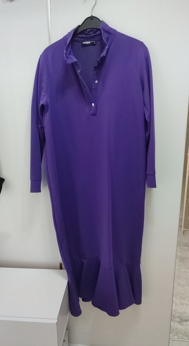 Mor renkte, uzun kollu ve yüksek yakalı uzun elbise. Yumuşak ve sıcak kumaştan, rahat ve salaş kesimle günlük kullanıma uygundur. missemira mis marka