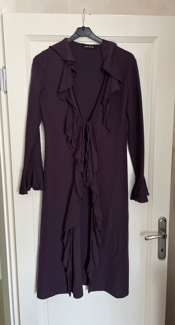 Uzun kollu, desenli dokulu mor, vücuda oturan uzun elbise. Ön kısmında fırfırlı detay ve bağcık bulunur, Paris tarzı görünüm sunar.